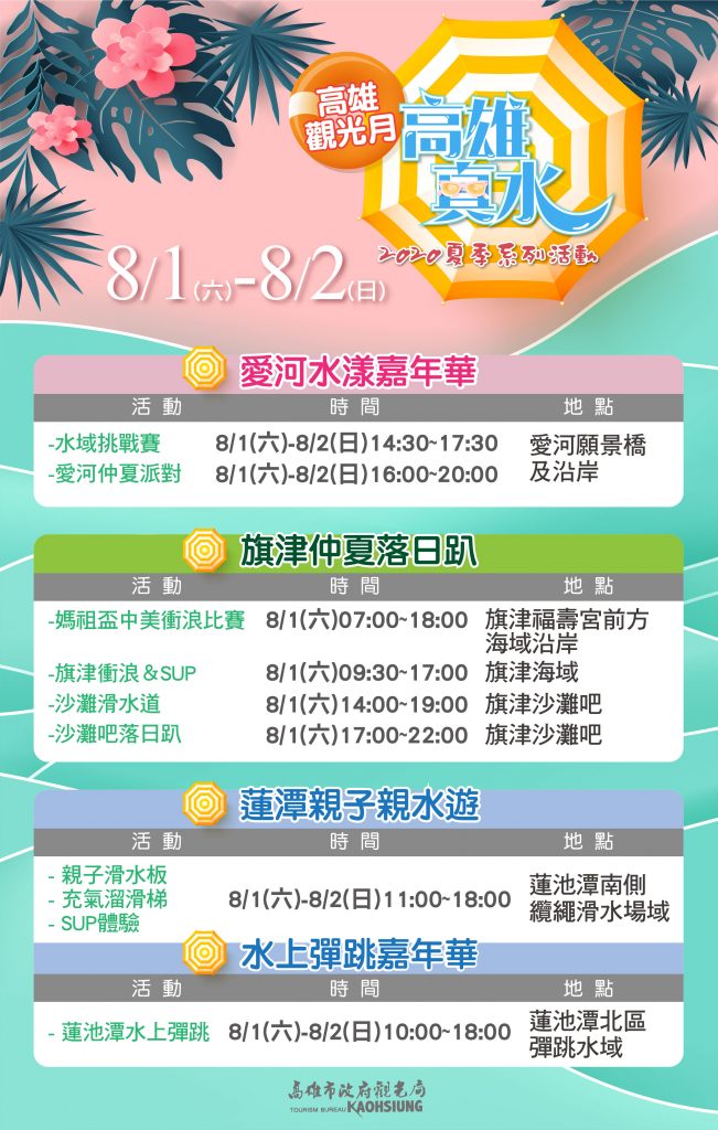 高市觀光局為打造旗津水域觀光量能,8/1起加碼推媽祖盃衝浪,吸引衝浪好手共襄盛舉,也歡迎民眾來現場為選手加油。此外,旗津沙灘滑水道前200名入場,就能獲得1杯清涼消暑飲品!蓮池潭水上彈跳及纜繩滑水,更是親子同樂的選擇,漂浮島、30米長滑水道,炎炎夏日不玩水要幹麻?!更多活動資訊請至愛河水漾嘉年華官網及高雄旅遊網查詢。