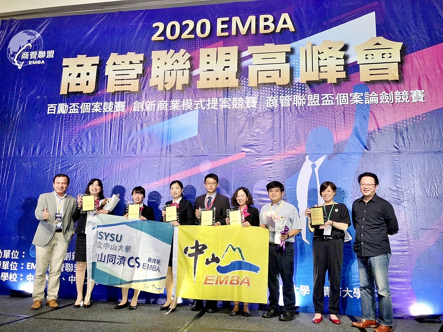 2020「EMBA商管聯盟高峰會」圓滿落幕,國立中山大學在3大競賽中擊敗眾多強者脫穎而出,在「商管盃個案論劍競賽」奪下台灣組最佳創新獎、「百勵盃創新商業模式提案競賽」榮獲企業創新獎、更一舉摘金,抱回「百勵盃個案競賽」最高榮譽「君子之鼎」獎座。經全國7校EMBA學員、19支隊伍激烈競逐,中山大學表現出彩。