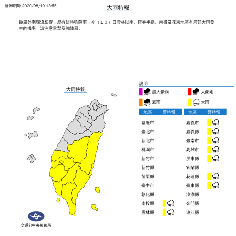 中央氣象局發布第6號海上陸上颱風警報,米克拉颱風預計在今(10)日以每小時23公里速度向北北東轉北進行,據最新氣相資料顯示,颱風中心目前在鵝鑾鼻西南方約390公里海面上,今夜至明天上午影響最甚,氣象局目前針對南台灣及東部9縣市發布大雨特報,提醒民眾切勿於颱風來襲期間,到海邊或港邊觀潮、釣魚,以免發生危險。
