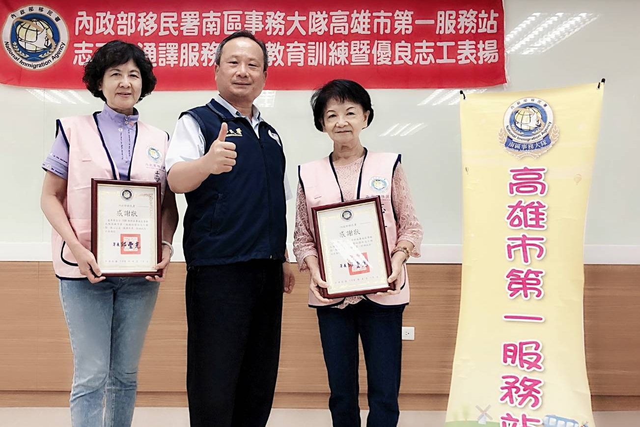 移民署南區事務大隊高市第一服務站今(12)日舉辦「109年志工及通譯教育訓練」,由臺灣高等法院高雄分院法官陳明富擔任課程講座,另高市社會局督導謝東宏分享「志願服務內涵及倫理」,以激發志工服務的初心及熱忱,第一服務站主任徐志權特別表揚站內優良志工吳雲釵,感謝全體志工與通譯無私的付出。