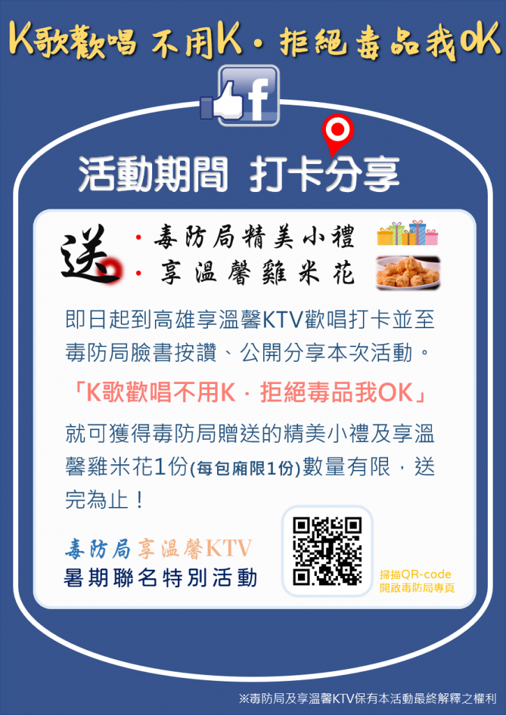 享溫馨庭園式KTV要免費送你好吃的雞米花,高市毒品防制局加碼送精美小禮物!毒防局首次與享溫馨合作,辦理「K歌歡唱不用K 拒絕毒品我OK」暑期聯名活動,共同打造杜絕毒品的安心消費環境,即日起在高市享溫馨消費打卡,在毒防局臉書按讚分享即可,額滿為止。