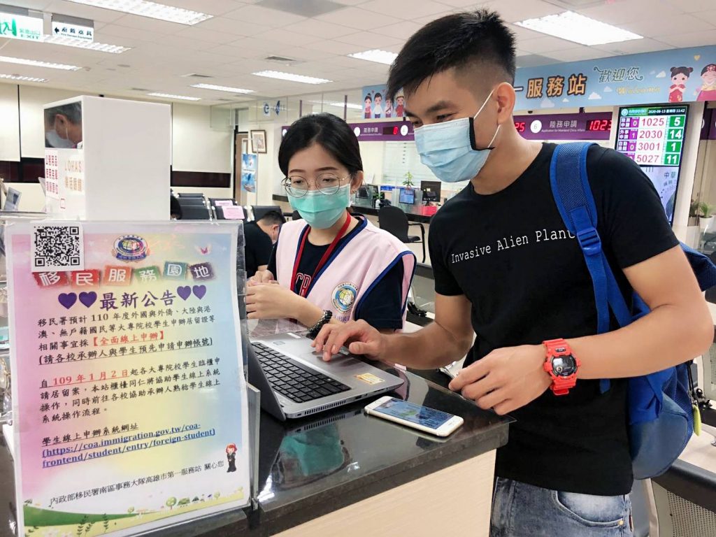 移民署推出「外國與外僑學生線上申辦系統」,讓外來學生輕鬆透過網路申請證件,還能使用便利多元支付的方式繳交學費,開學辦件需求多,移民署南區事務大隊高市第一服務站結合策略聯盟,讓文藻外語大學實習生以「線上申辦小導師」身份,協助到站學生操作線上申辦系統。