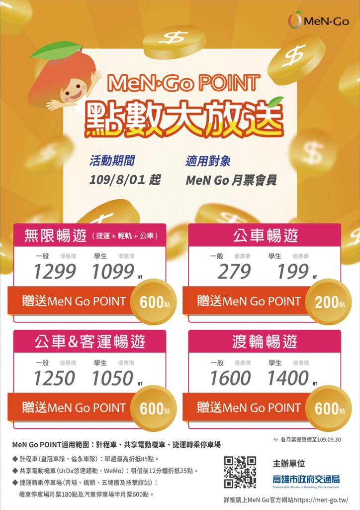高市交通行動服務MeNGo計畫交通月票再進化,除至9月底前提供200到249元降價優惠,MeNGo Point折抵使用範圍有計程車、共享機車、捷運轉乘停車場等,自今(109)年8月起至12月底,購買MeN Go各類交通暢遊月票可獲得MeN Go Point 最高回饋600點數。