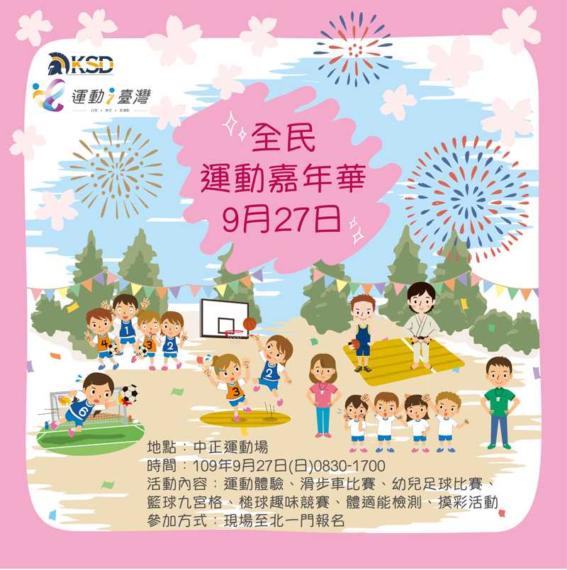 此外9/27即將在中正運動場舉辦的全民運動嘉年華活動多樣化,現場將設有飛盤、籃球足球、拳擊、柔道、射箭、單車、扯玲、棋類、飛鏢等多項活動,歡迎民眾踴躍報名參加!不僅如此,還有體適能免費檢查以及摸獎活動。