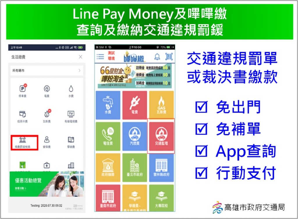 即日起,交通罰緩可使用手機行動支付,透過「Line Pay Money」及「嗶嗶繳」等APP程式查詢及繳納,高市交通局表示,現行交通違規罰鍰繳納管道多元,現在更多了手機APP服務,一機在手輕鬆操作,服務便捷再升級,且手續費僅13元,不必擔心紙本罰單搞丟或是出門繳費不方便,省時又省力。