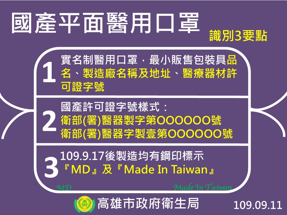 目前市售口罩分一般和醫用口罩兩種,如何明辨實名制口罩是否為MIT台灣製醫用口罩?高市衛生局教你辨真偽,台灣生產的醫用口罩都要加上MD(醫用)及(MIT)的鋼印標示,貼心提醒民眾,務必到領有合法販賣藥商許可執照的通路購買,並注意是否包裝完整且有上述兩項鋼印標示。