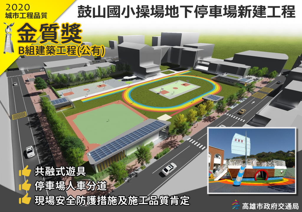 榮獲B類組-建築工程(公有)-金質獎的是由交通局興建的鼓山國小操場地下停車場新建工程,特色是設置呼應當地特色共融式遊具且人車分道兼具安全,由一功營造承攬,去(108)年8/19開工,預計今(109)年12月底完工,設有184輛小型車車位,可望有效疏解停車需求帶動哈瑪星地區觀光發展。