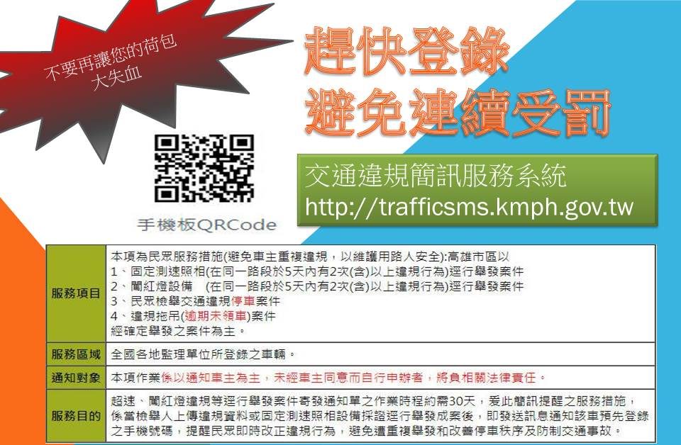 高市警察局交通大隊表示,申辦服務很簡單,只要系統服務網站登錄基本資料與手機號碼,系統會發出簡訊通知審核結果,當檢舉人上傳違規資料及固定桿測照案件(民眾檢舉違規停車、同一路段5天內有2次以上違規、拖吊違規逾期未領車)受理成案後,系統將同步發送訊息通知申請人,提醒民眾即時改正。