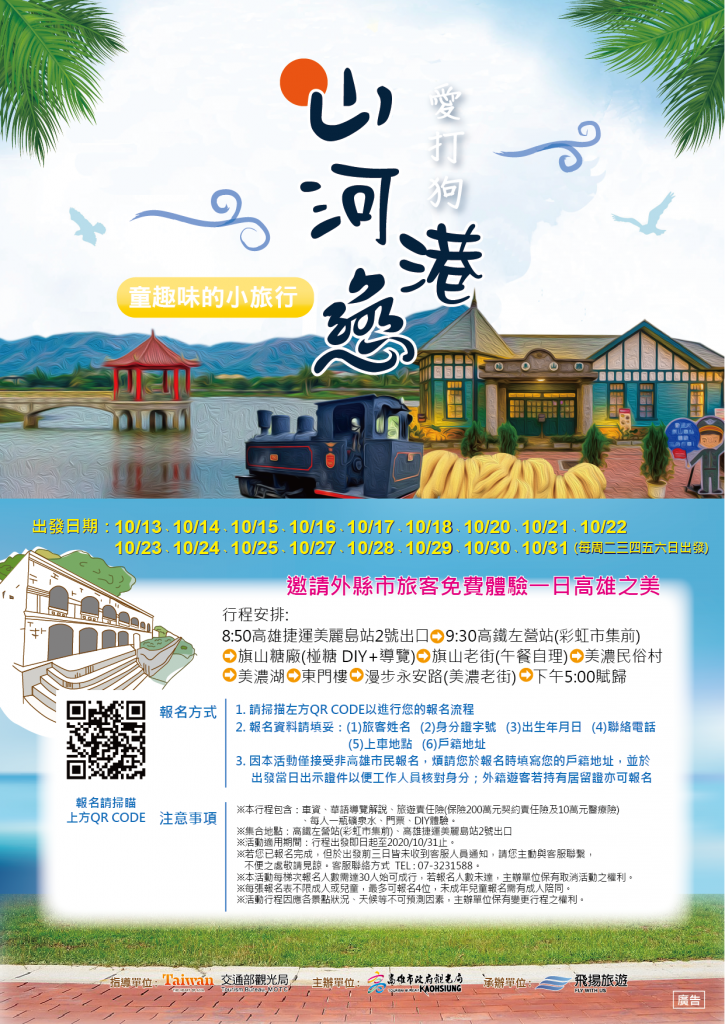 國旅夯,許多民眾趁著交通部「安心旅遊」補助進入尾聲前,利用連假怒玩一波,而高市觀光局也趁勢加碼推出一日免費遊程,廣邀高雄以外的民眾來高雄旅遊!首波針對國慶連假,搭配旗津黑沙玩藝節,推三條主題路線,無論上山下海都能玩得盡興!即日起開放報名,額滿為止,有興趣的民眾可上高雄旅遊網查詢。