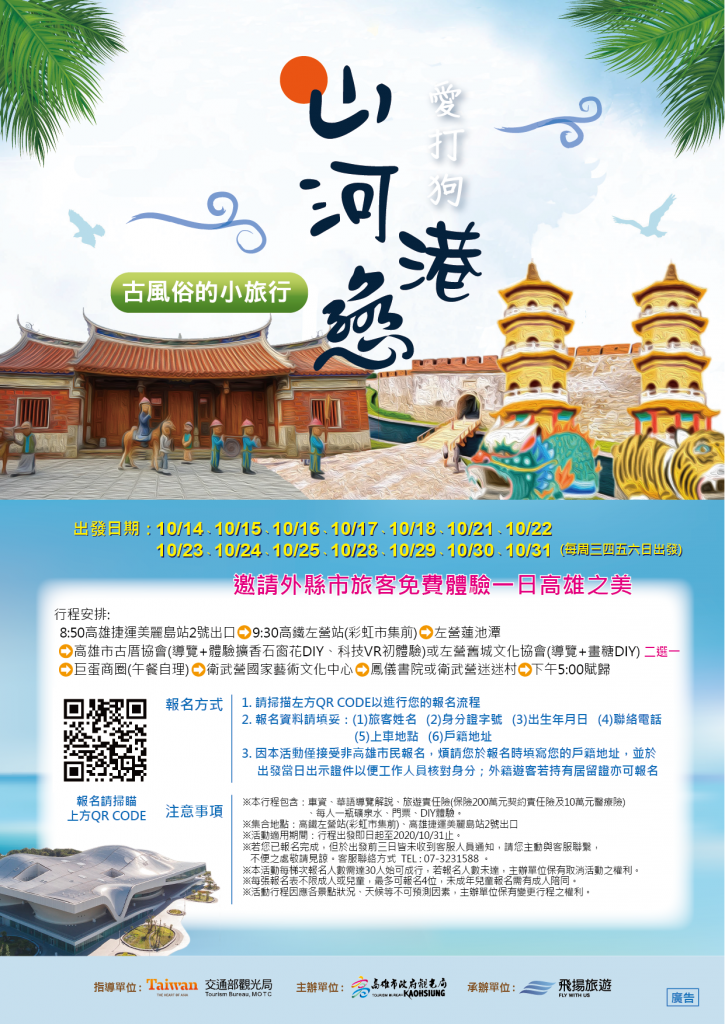 10/13則是帶大家來到高雄後花園「旗山、美濃」區域,有一系列饒富童趣的主題遊程,走訪旗山糖廠體驗椪糖DIY外,漫步在旗山老街、美濃民俗村、美濃湖、永安老街等地,好山好水讓身心靈得到紓解。而10/14,將深度走訪百年舊城牆與蓮池潭畔,還能體驗擴香石窗花及畫糖DIY等活動。
