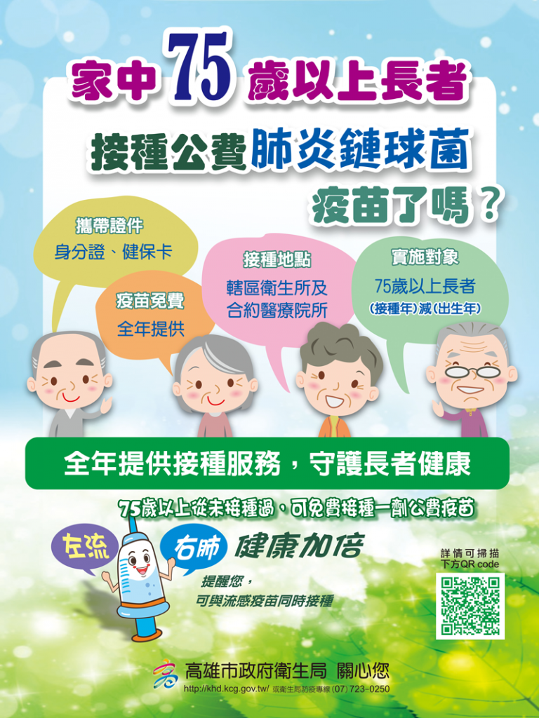 今年公費流感疫苗已在5日開打,高市衛生局呼籲禮讓65歲以上長者等高風險族群優先接種,衛生局昨(7)日啟動各級醫療院所疫苗配額調控措施,未來會視疫苗到貨與民眾接種狀況機動調整,同時提醒75歲以上長者如未接種肺炎鏈球菌疫苗,可與流感疫苗同時施打!