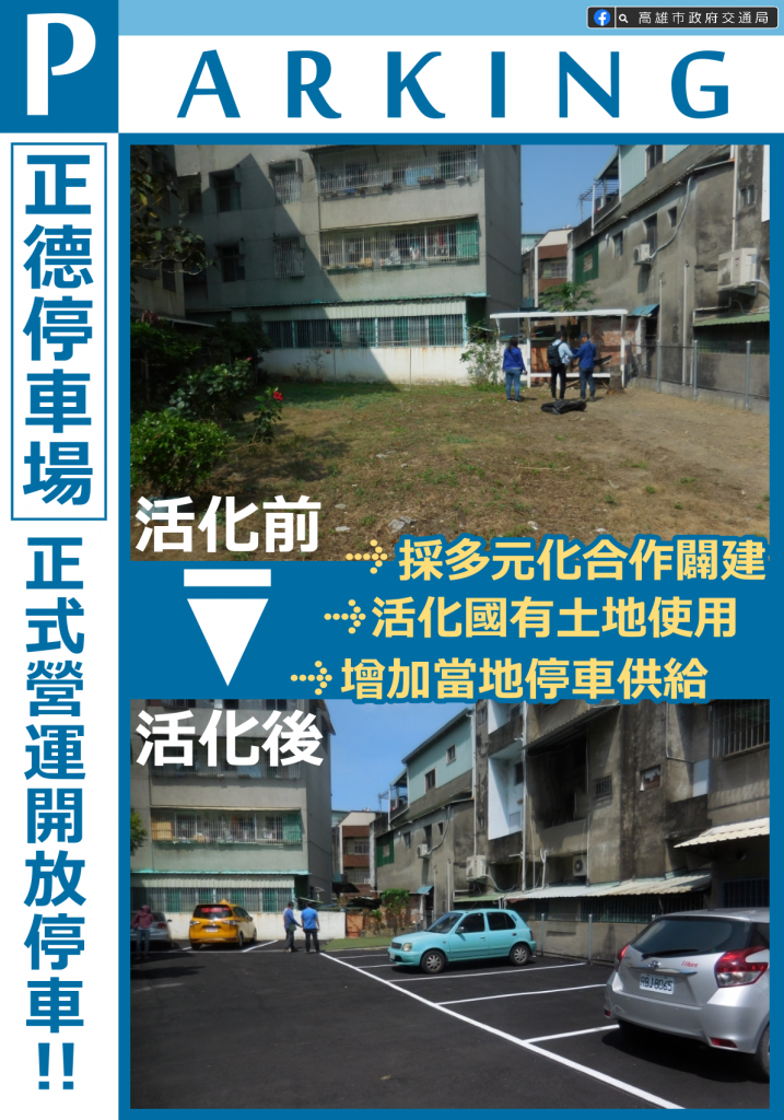「高雄正德停車場」即日起開放使用,停車費率採計次收費,每6小時計費一次,每次新台幣30元,共可容納小型車停車格位14格(含身障格位1格)。