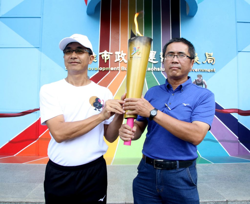 109年全民運動會10/17起至10/22在花蓮縣熱鬧舉行。聖火從9/26起自花蓮出發,今(12日)天上午傳遞到高雄,由高市運動發展局專門委員謝汀嵩、高市體育總會秘書長郭佑任迎接,轉交高市聖火隊,完成交接儀式後,繼續轉往屏東縣、台東縣傳遞。