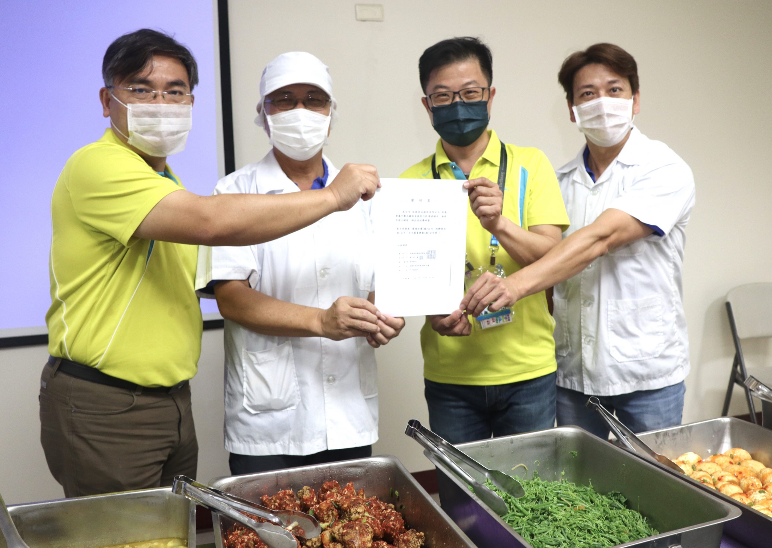 不少家長關心孩子在校用餐問題,除了學校發放的營養午餐菜單外,新上國小家長會長為此,特別邀請家長們來到長期負責新上國小學童午餐團膳的佳琪食品公司,讓家長了解學校營養午餐食材、團膳工廠作業流程與規範等,同時,新上國小校長王彥嵓表示,當初將公辦公營轉為「民辦民營」是經過全校親師生投票決定,就是希望讓學童有更好的用餐品質,現在萊豬問題造成許多家長擔心,今天就與佳琪食品公司董事長蔡文村,簽署署學校午餐豬肉使用CAS國產豬肉,一同為學生午餐把關「萊豬」問題。