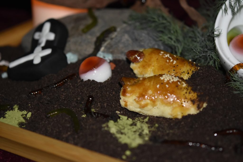 為迎接萬聖節,高雄翰品館內港都茶樓茶餐廳與館外品中信茶餐廳在10/31當天推出三道限量創意萬聖節美味港點, 品日本料理餐廳也推出贈送鬼怪壽司、甜點活動,無論是重量恐怖級的骷髏豬肋排餐、超吸睛的內臟麵條,蚯蚓凍還有最經典的巫婆手指餅乾,或是淋上糖漿的血淋淋杏仁凍眼球都超級搞怪,好吃有趣!