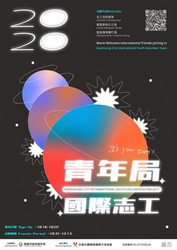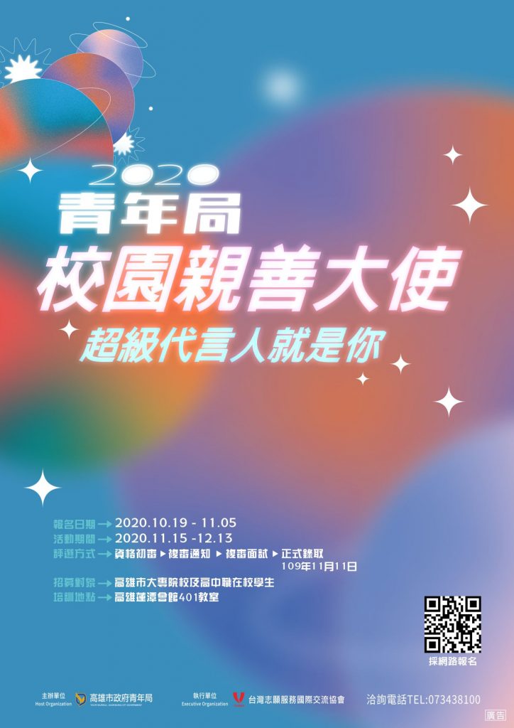高市青年局就是要你,大港青年!青年局「國際志工團」熱力招募60位種子青年志工,善盡一己之力成為高雄在辦理國際活動時最迷人的軟實力!另外也極力招募40位「校園親善大使」未來將成為青世代參與公共事務的領袖,報名至10/22止,有興趣與熱忱的你別猶豫了!