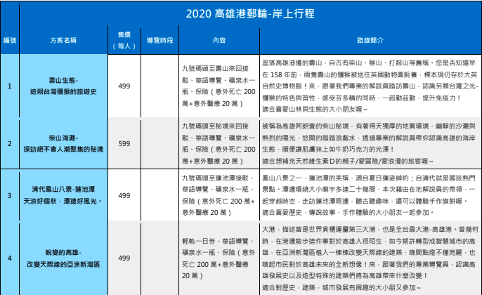新冠疫情下國旅夯,業者推「打狗任你郵」套裝行程搶市,推薦以四大主題進行,壽山生態、柴山海灘、清代鳳山八景、蛻變的高雄,逐步欣賞高雄特有的城市風貌與文化底蘊,不僅如此,棧貳庫旗津航線更與旗后商圈合作,推「旗津澎湃包‧老街吃海產」精彩遊,就是要讓更多外地遊客輕鬆玩高雄。