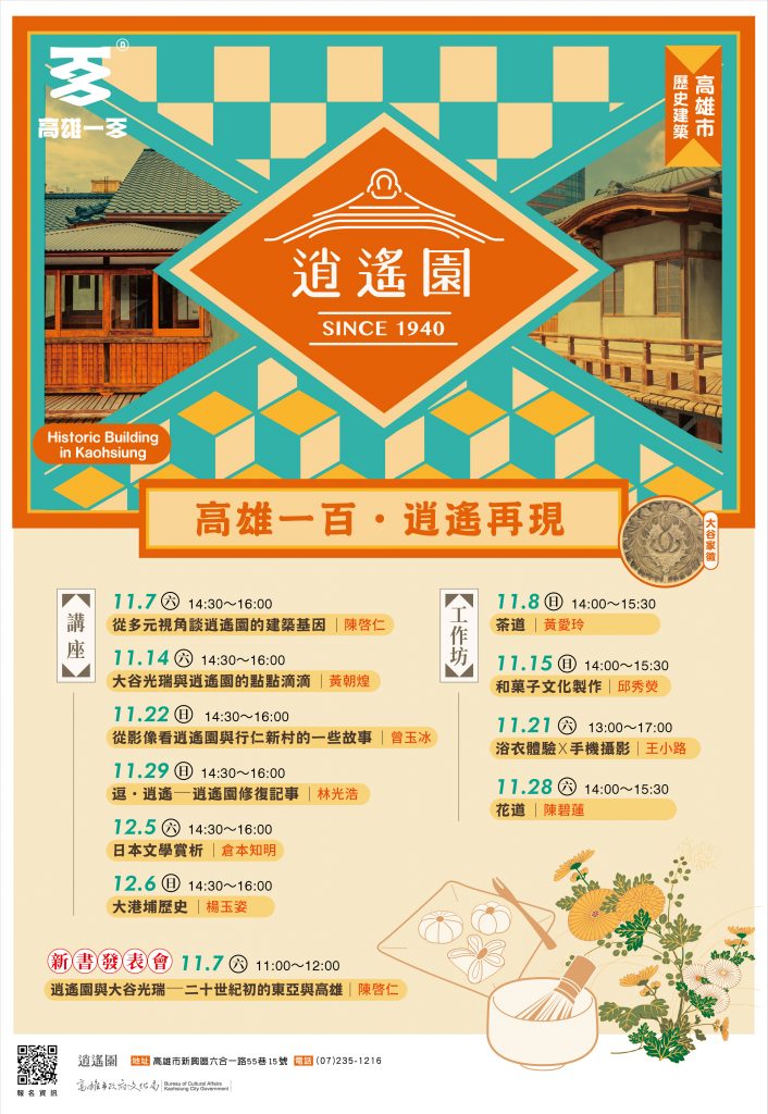 隱身在六合一路靜僻巷弄裡的逍遙園是日本華族、淨土真宗西本願寺第22代法主大谷光瑞在台灣的別邸,從1940年至今,走過風華與殘破不堪,80年來有許多故事等待被訴說與翻閱,適逢打狗改名高雄100年之際,精心策劃從歷史、古蹟修復、攝影、文學、茶道、飲食文化等面向探討逍遙園豐富內涵講座與工作坊,王文翠進一步表示,今(109)年11月至12月的週末,有多場精湛的講座與文化體驗,11/7率先登場的《逍遙園與大谷光瑞:二十世紀的東亞與高雄》新書發表會,將帶領讀者揭開大谷光瑞多重身份下與逍遙園的神秘面紗。
