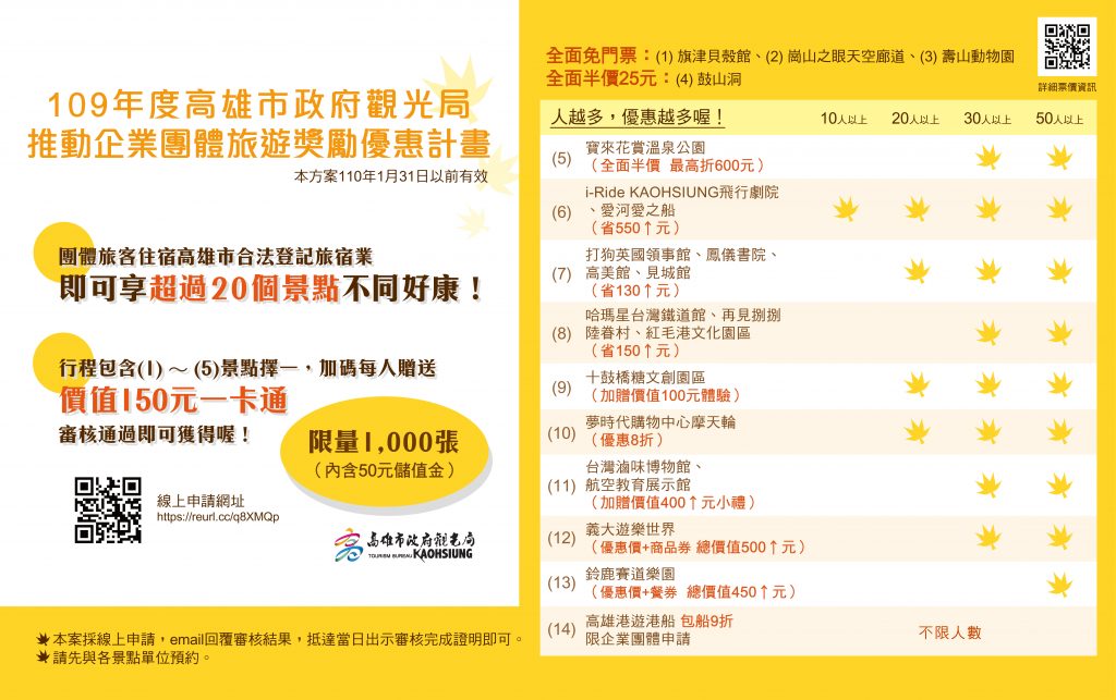 只要是前1000名符合資格的團客可獲價值150元的限量一卡通(含50元儲值金),送完為止。領取一卡通的團體,行程需包括以下景點「旗津貝殼館、崗山之眼天空廊道、壽山動物園、鼓山洞、寶來花賞溫泉公園」擇一,更多申請資訊可上高雄旅遊網「最新熱推」專區,優惠活動至110/1/31止。