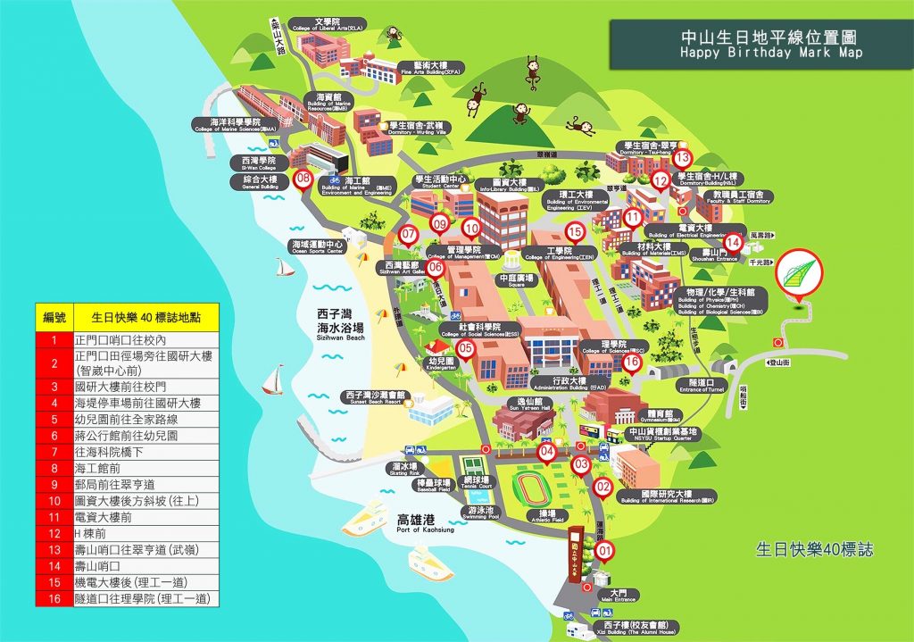 此外,「生日地平線·快樂似無限」活動,則是在校園內16處道路上,繪製融合校徽梅花的「生日快樂40」的字樣,這項發想是以中山校內道路的「地平線」結合西灣「水平線」及柴山「地景線」,形成校園內浪漫的「另類台三線」,歡迎民眾踩著充滿喜氣的「生日快樂」,感受中山生日的喜悅之餘也在中山留下美好回憶。