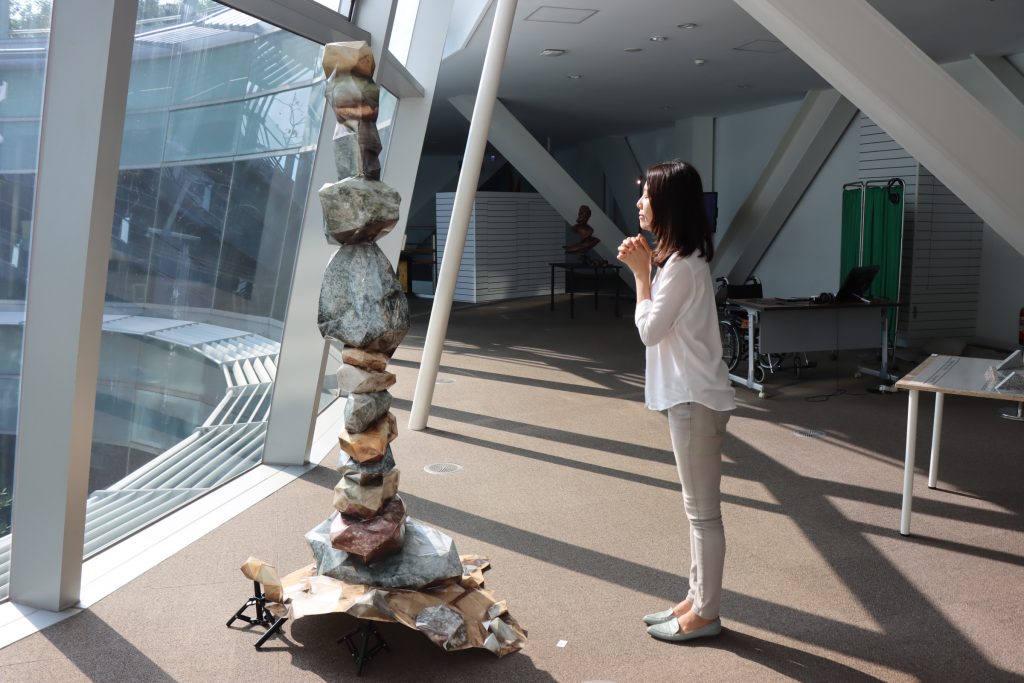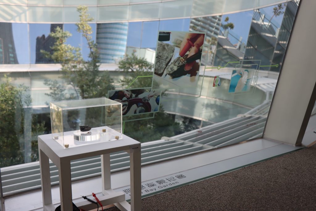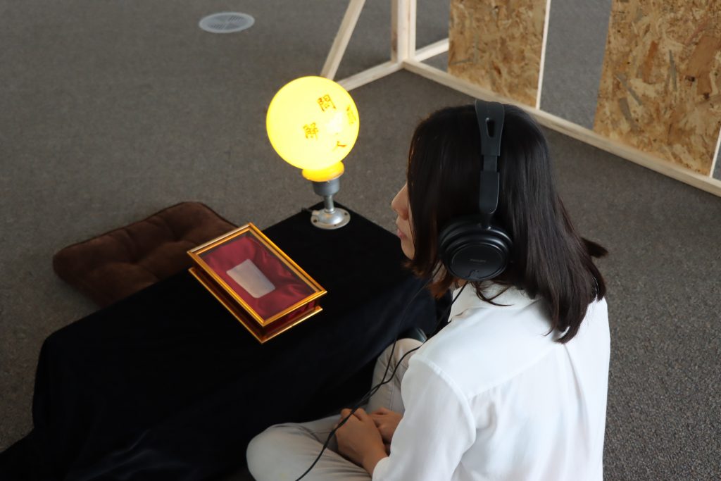 策展人朱峯誼提到,高市圖迴廊的空間氛圍很棒與作品內容十分契合,而透過白晝自然光的光影變化加上夜間設計的燈光照明,呈現出不同的場域氛圍,各有美感!尤其在夜晚搭配總圖藍紫色燈光,的確讓許多讀者著迷深陷在神秘的場域氛圍。