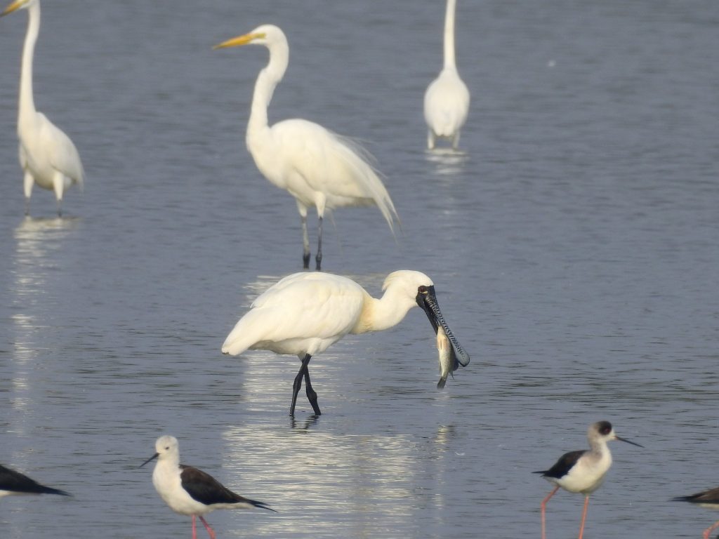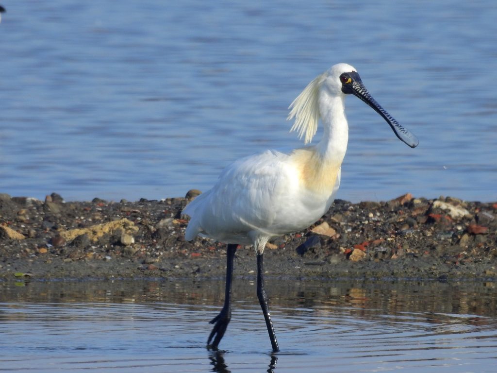 永安濕地最受矚目的鳥界Super Star就屬一級保育黑面琵鷺,數量稀少!全球曾只記錄到288隻,是瀕臨絕種的保育類動物,其黑色的臉龐與扁長如匙的鳥喙是他的最大特徵,一身雪白的羽毛更襯托其英氣非凡!黑面琵鷺長扁的嘴巴在水裡左右翻來攪去,搖頭晃腦的可愛模樣,也是觀賞的一大亮點。