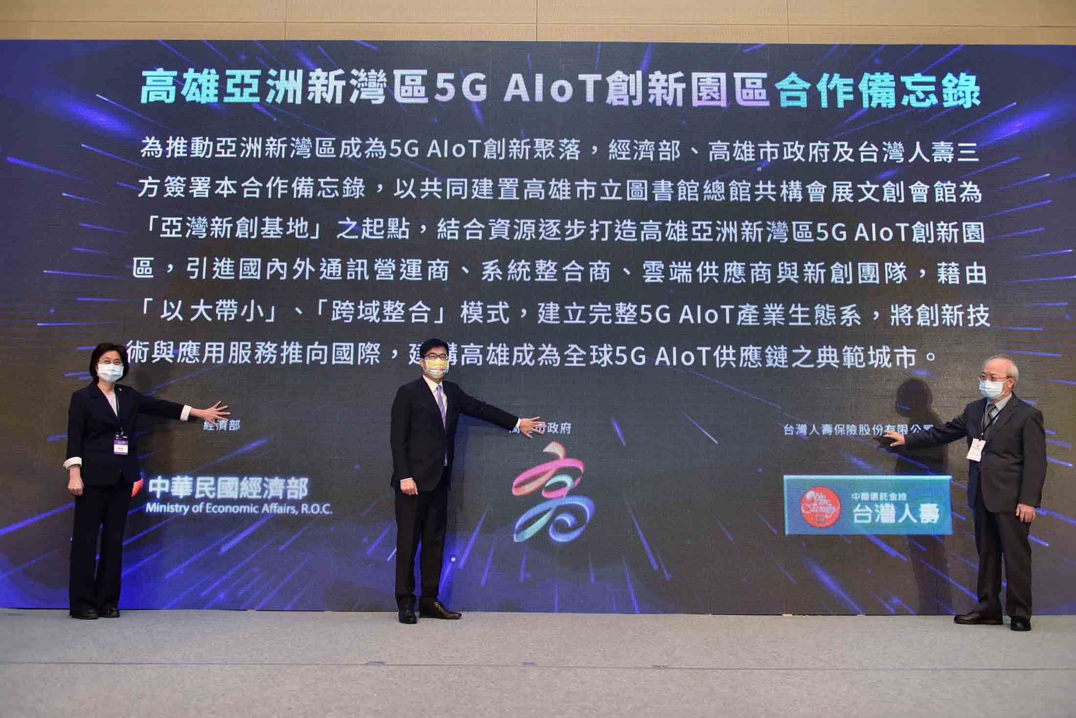 為推動亞洲新灣區成為5G AIoT創新聚落,市府、經濟部及台灣人壽三方現場簽署合作備忘錄,將於台壽BOT大樓設置高雄首個由中央與地方合作的新創孵育基地,引進國內外通訊營運商、系統整合商、雲端供應商與新創團隊,建立完整的5G AIoT生態體系。