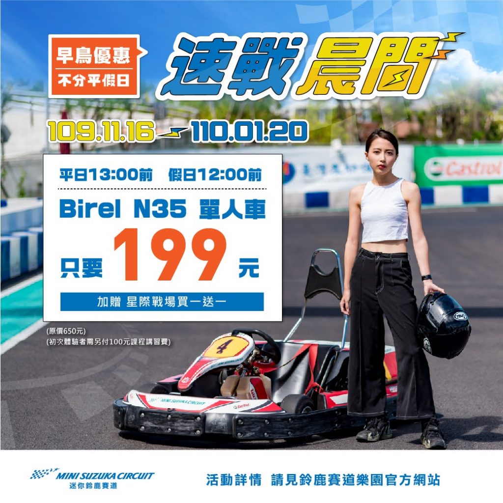 鈴鹿賽道樂園擁有日系血統的等比縮小專業F1賽道,是許多車手競速首選,現在鈴鹿賽道樂園推出早鳥卡丁優惠,不分平假日通通只要199元,平日下午1點前、假日中午12點前入場,續尬只要149元加購價,即使初學者也別擔心,工作人員會有詳細的安全講習說明,快約好友一起尬車吧!