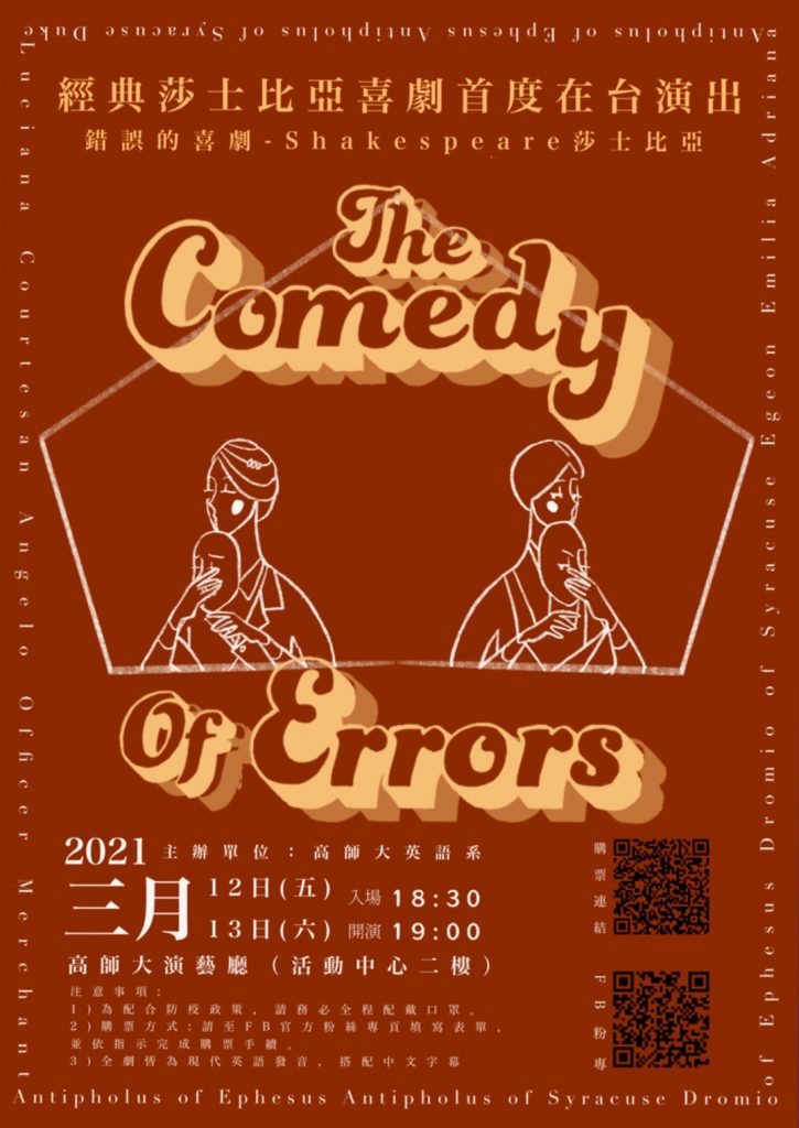 行政總監廖翊伶特別提到,有別以往的暗黑風格戲劇,2021全英語演繹「莎士比亞」的經典滑稽喜劇-錯誤的喜劇《The Comedy of Errors》,同時配有中文字幕,故事內容主要講述雙胞胎的身分被混淆、誤解,引起一連串令人啼笑皆非的誤會。製作人兼導演蔡玟妤進一步指出,高師大英語系再次將經典劇作帶給南部觀眾,誠摯邀請大家共襄盛舉,在充滿歡笑的氛圍下一起渡過艱難的疫情時期。