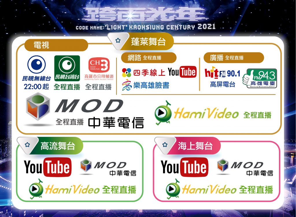 高雄跨百光年相關系列活動規模與格局前所未見,民眾可選擇到高流舞台、蓬萊舞台、海上舞台及八大場景等參與高雄跨百盛事,12/31中午12點起,高雄鹽埕、哈瑪星地區啟動交通管制,除當地居民商家外,禁止車輛通行,若要前往「2021跨百光年」會場可多加利用捷運或輕軌。