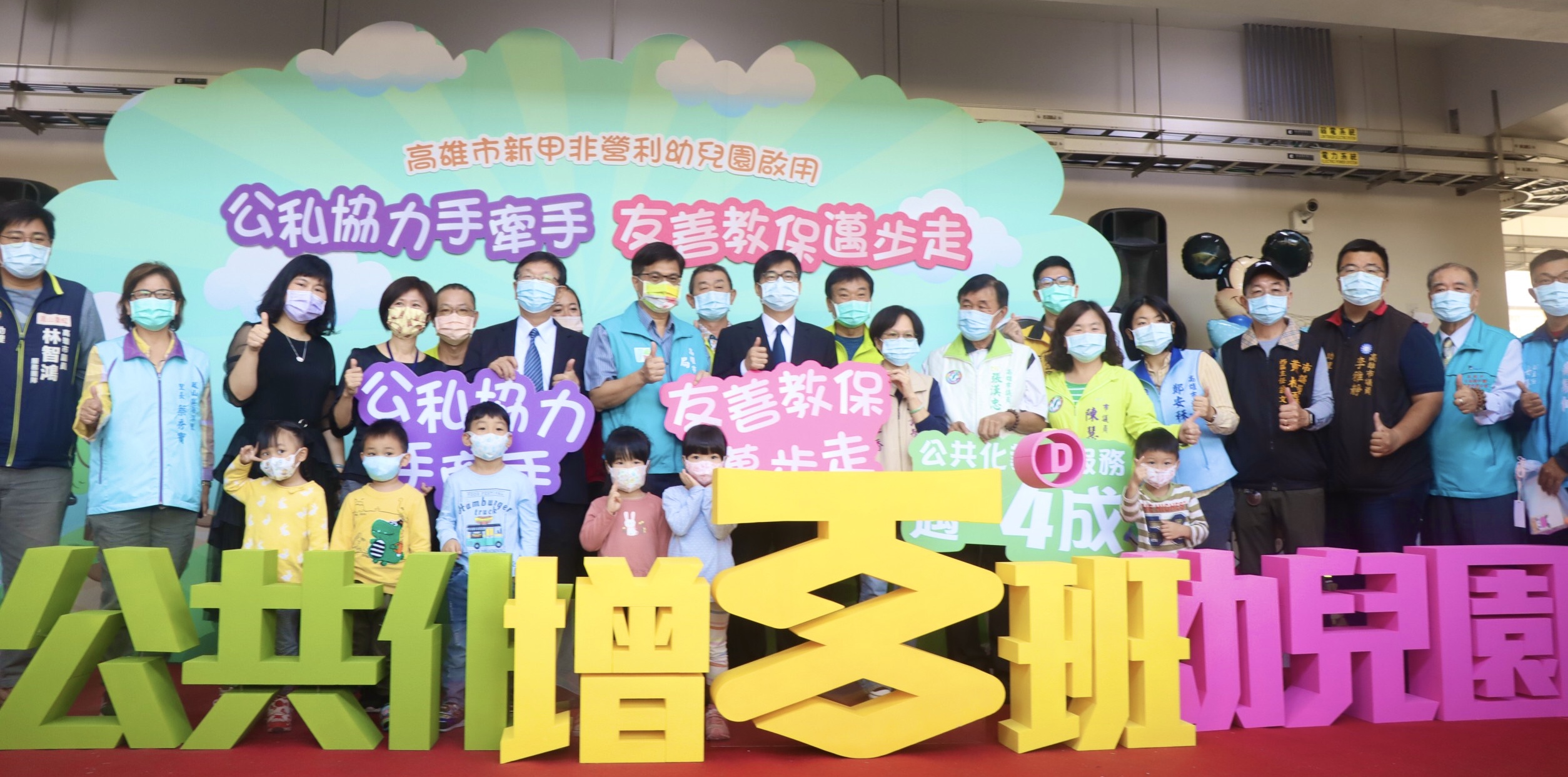 高雄市鳳山區新甲非營利幼兒園今(28)日正式啟用,高雄市長陳其邁與教育局長謝文斌也化身一日教保員,陳其邁更宣布高雄市110學年度公共化幼兒園將再增百班,全市公共化教保服務供應量邁向4成,同時承諾普設公幼園主,並調薪至3萬2千元。