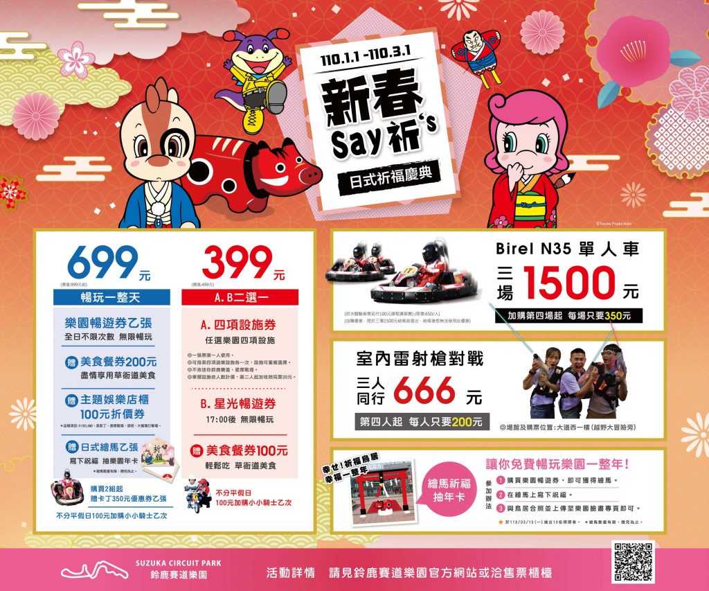 農曆春節期間2/12至2/16下午4點半,由酷奇拉家族帶來的「你說奇怪不.祈怪」春節限定演出,帶領大家大跳祈福慶典舞,揮手向2020道別!高雄鈴鹿賽道樂園,不僅交通超便利,更是全台唯一一座搭乘捷運就抵達的樂園,搭乘高雄捷運紅線直達草衙站2號出口,一出站樂園近在眼前,省去了連假出遊的舟車勞頓,搭乘大眾運輸工具既環保舒適又省時。更多詳情請上鈴鹿賽道樂園官網(http://www.suzukacircuitpark.com/)。