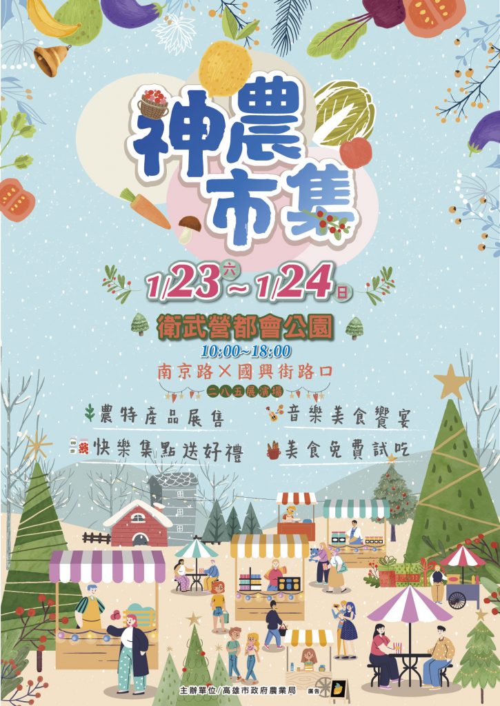 神農市集從23日早上10點至下午6點,在衛武營都會公園(鄰近南京路與國興街)登場,想挑安心年貨食材的民眾不要錯過,現場除提供讓人食指大動的農特產試吃活動,接連三小時優質的Live音樂演出讓你回味無窮,更有購物集點換好禮的好康活動,週末無事快來聽音樂吃美食鬥鬧熱!