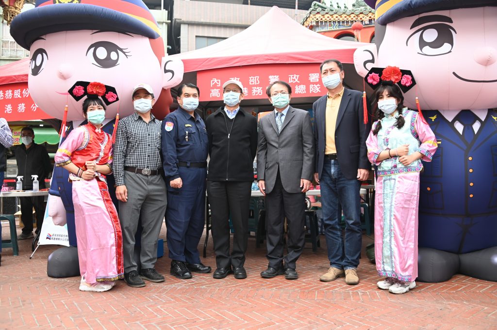 高雄港務公司執行副總經理張國明偕同高雄地方法院院長陳中和、高雄港務港警總隊長林新晃來到活動現場慰勞書法老師,並與民眾互拜早年,祝福社區好鄰居、好朋友們能有更健康平安,朝著目標努力實現的金牛年,每人新春好彩頭。