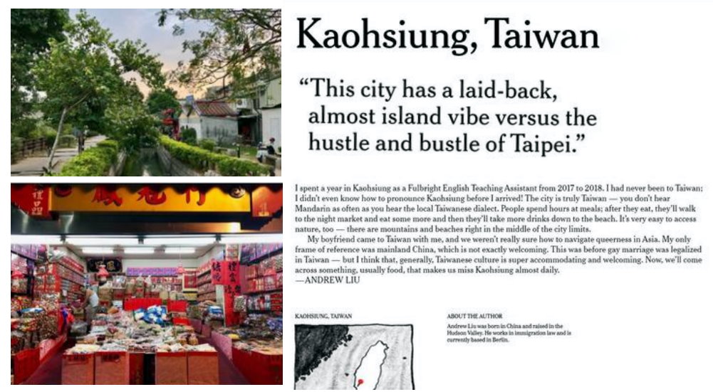 高雄獲紐約時報「2021值得愛上的地點」,國際能見度大增!而投稿推薦是英語教學助理劉尚之,2017年他透過「傅爾布萊特」(Fulbright)計畫來高雄市學校擔任英語教學助理,1年的時間內深受高雄山海河港與愜意的城市氛圍所吸引,他認為港都才是真正的台灣。