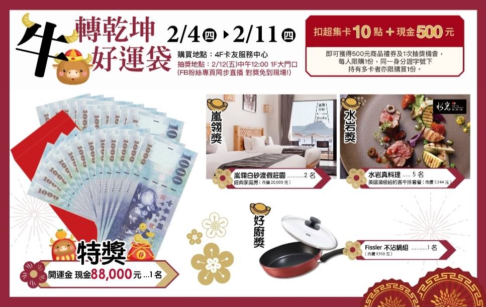 新年到許多民眾都會買福袋討吉利,高雄漢神百貨祭出牛轉乾坤好運袋活動,不僅有飯店住宿券、頂級餐廳牛排餐券、廚具組等,還有現金大獎!2/4至2/11可在漢神百貨4樓卡友服務中心購買,因應防疫,抽獎方式採線上直播,結果將公布在漢神百貨官網、APP,另外漢神超級卡友只要扣10點點數加500元現金就能換500元禮券囉!