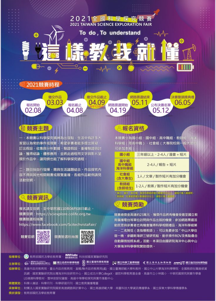 為提升國人對科學的興趣,由高市教育局協辦,財團法人國家實驗研究院國家高速網路與計算中心、國立自然科學博物館、國立海洋生物博物館主辦「2021「全國科學探究競賽-這樣教我就懂」邁入第八年,這項競賽希望學生與社會大眾能主動發掘、觀察生活習以為常的科學現象,提出質疑、訂出假設、收集與分析數據、驗證假設、重複驗證與討論、獲得結論與遷移作用,並將整個過程用繪圖、影片與文字呈現於作品中,讓同儕也能了解科學探究過程。