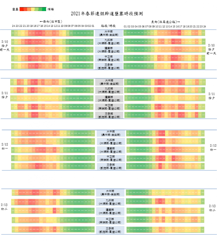 根據往年春節車流數據統計,大年初一(2/12)至初四(2/15)期間為各景點出遊高峰期,往旗津地區在每日12點到18點,回程往市區方向則在每日12點到19點易有車潮湧現。