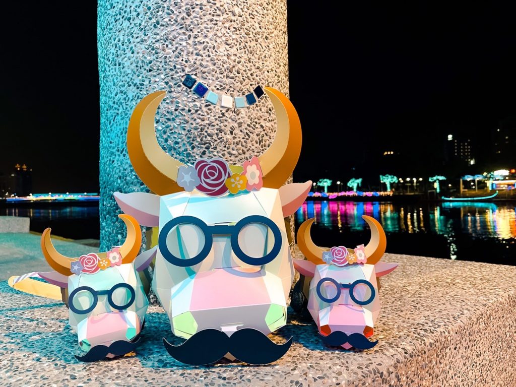 這款造型時尚,可揹可提的牛揹揹小提燈,設計靈感來自高雄流行音樂中心,幾何的牛面不僅時尚大方,配色也走文青風,繽紛的馬卡龍色調,讓人超想收集,加上結構設計特別,還能收納輕量的隨身物品,像是外出不可缺少的口罩、手機都可放在背面八角形紙盒形成的置物空間裡頭!除了造型特別,連配件都有!像是髮飾、鬍子、眼鏡、領結等可任意搭配在牛頭上,是一款極具個人化的創意元宵提燈。