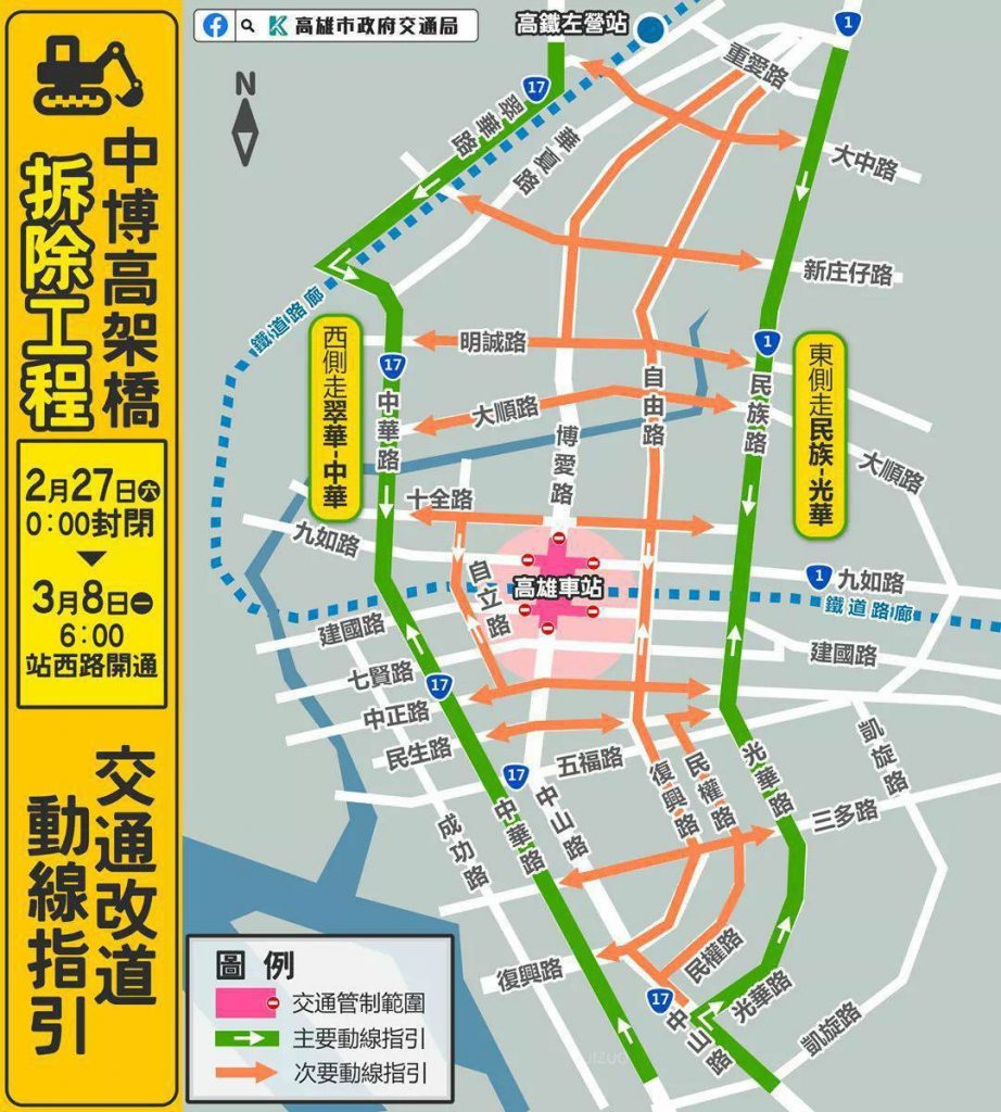 2/27中博高架橋準時鳴笛開工拆除,預計3/8上午6點完工並開放高雄車站西側站西路通車,警交大提醒用路人行經施工管制區域(建國二、三路東至林森路口、西至同愛街口;九如二路東至大連街口、西至哈爾濱街口;博愛路自熱河街口以南;中山路自八德路口以北)多利用替代道路,以避免道路壅塞。