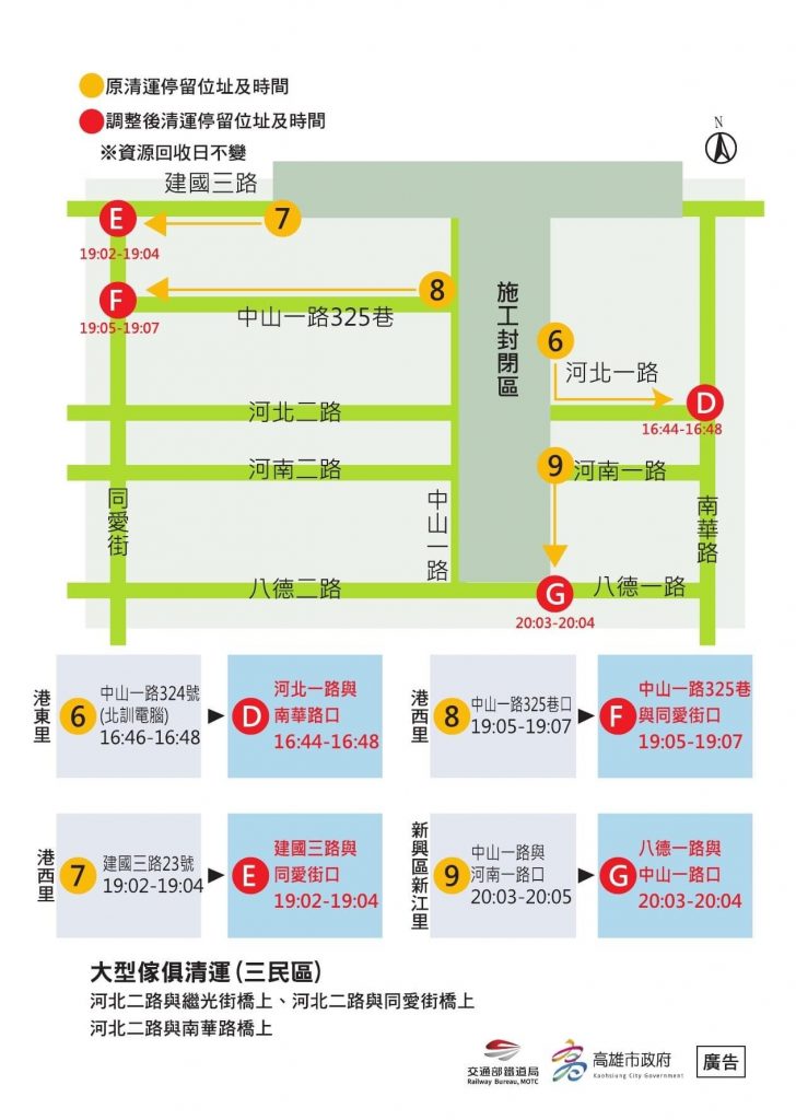 高市環保局表示,垃圾收運影響範圍包括三民區德行里、精華里、達仁里、達德里、港西里、港東里共八處,以及新興區新江里一處,其餘非屬施工範圍的封閉路段的清運點則不受影響,仍維持原時段及地點收取垃圾。