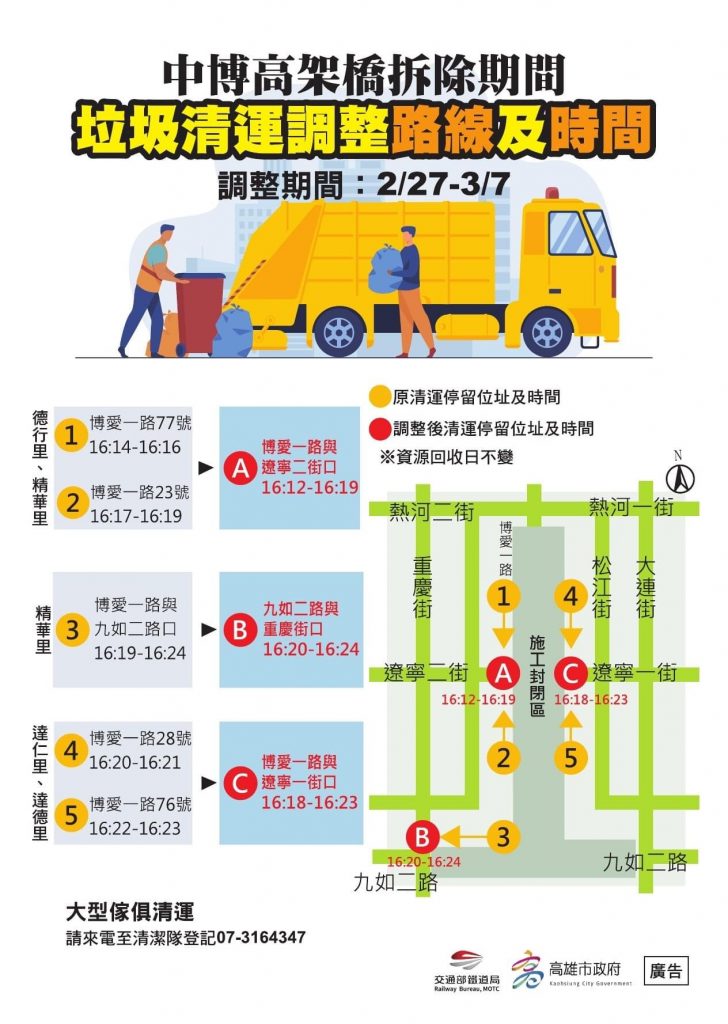 環保局強調,配合施工封閉範圍,調整後垃圾車收運停留點為三民區博愛一路遼寧二街口、三民區九如二路與重慶街口、三民區博愛一路與遼寧一街口、三民區河北一路與南華路口、三民區建國三路與同愛街口、三民區中山一路325巷與同愛街口,以及新興區八德一路與中山一路口,調整期間為2/27起至3/7止,請民眾配合改至調整後的垃圾車停靠點等待,並於垃圾車完全停妥後再行丟擲垃圾,造成市民不便仍請見諒。