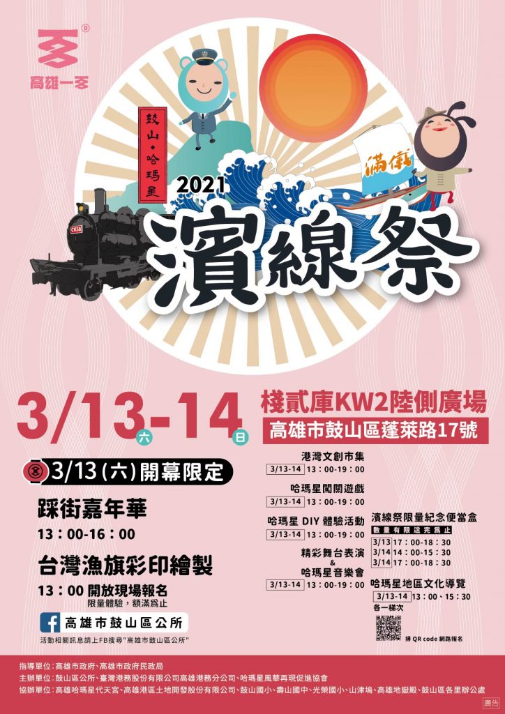 這個週末最盛大的活動在棧貳庫!「2021哈瑪星濱線祭」將在3/13與3/14兩天復刻登場!現場不僅有精彩的踩街活動,還有漁旗彩繪體驗,熱鬧程度宛如嘉年華,另有威風陣頭、鬼滅Cosplay、重頭戲有百年舢舨福船與「撒吉」祈福活動。