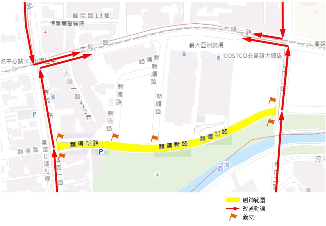 工務局表示,3/16日晚上封閉龍德新路(新德路至自由二路段)北側車道,3/17日封閉龍德新路(新德路至自由二路段)南側車道,施工期間施工單位會隨時注意車流情況,即時檢討交維引導措施,義交人員也將機動調整配置,減少施工造成交通壅塞。