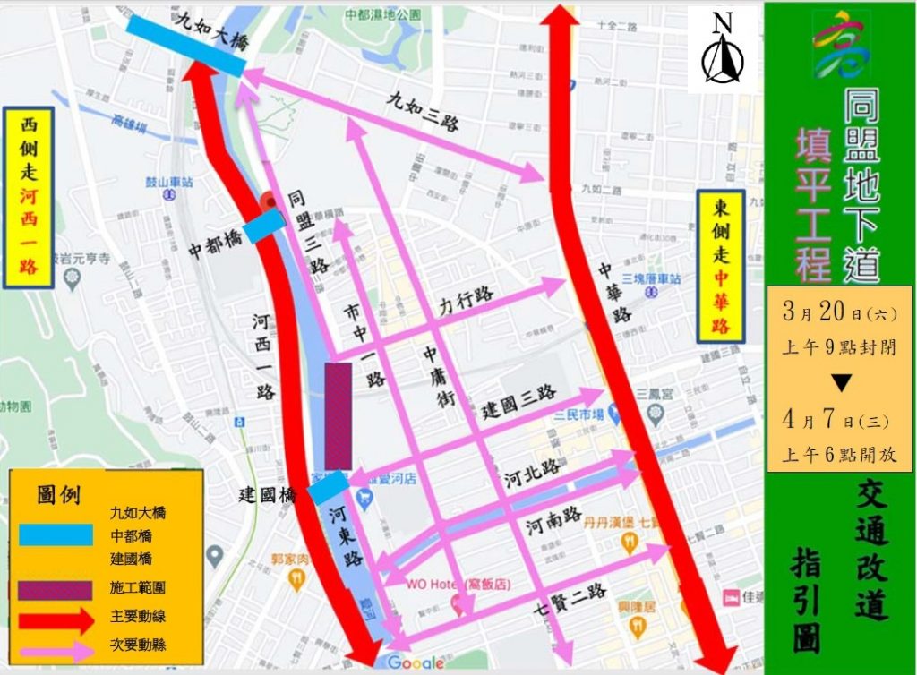 工務局提醒,施工期間工區周邊設有臨時指示標誌通行與義交人員現場指導,駕駛人行經同盟三路可由中都橋或建國橋改道河西一路,南北向車輛請改行市中一路、中庸街及河西一路,詳細改道路線詳交通改道指引圖,同盟路填平工程延長施工時間為每天上午8點到晚上10點。