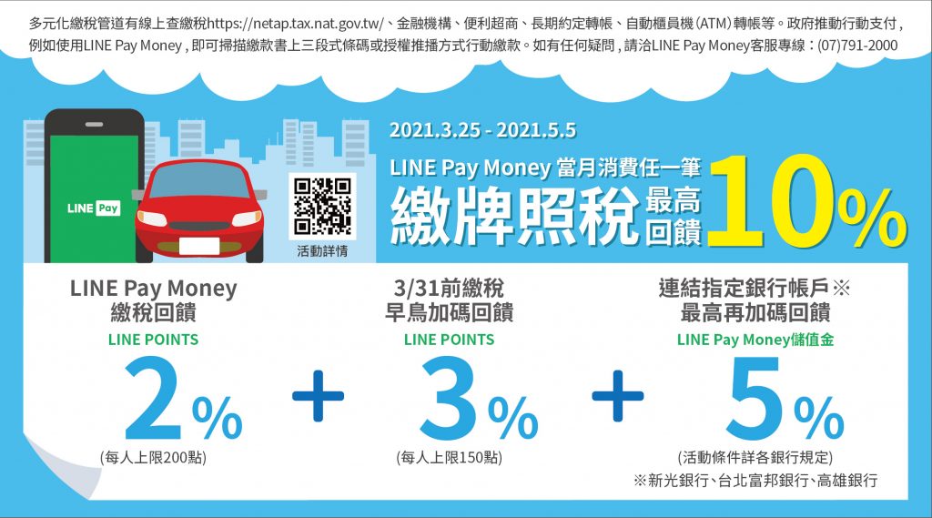 繳稅季將至,一卡通也釋出多項優惠方便民眾繳費,3月底前繳納使用牌照稅最高10%回饋,即日起至5/5止,同時LINE Pay Money也祭出早鳥優惠,繳稅期間透過LINE Pay Money繳使用牌照稅,即享LINE POINTS 2%點數回饋,3月底前繳稅再享早鳥3%點數回饋,連結特定銀行儲值最高有5%儲值金,最高總計10%回饋,越早繳稅省越多!