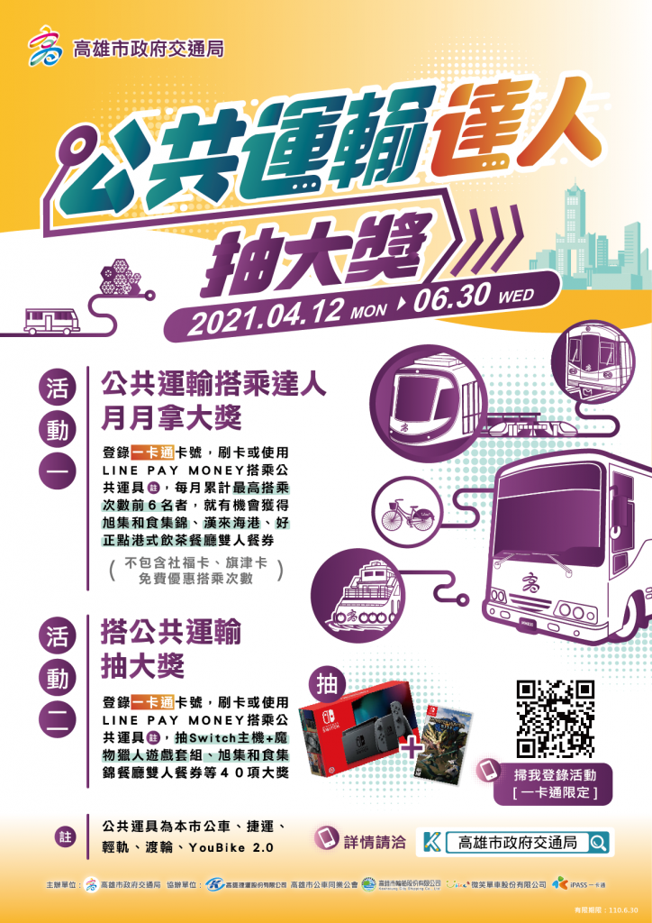 交通局「公共運輸達人抽大獎」活動資格超簡單,只要報名搭乘高雄市公車、捷運、輕軌、渡輪、YouBike2等5大公共運具,就能參加「月月公共運輸搭乘達人獎」及「搭公共運輸抽大獎」兩項活動,想把最夯的Switch魔物獵人遊戲套組、旭集和食集錦Buffet雙人餐券、海港餐廳Buffet雙人餐券帶回家?活動詳細訊息請上交通局官網(http://www.tbkc.gov.tw)、FB臉書粉絲團「高雄市政府交通局-轉動高雄青春夢」把握機會參加活動。