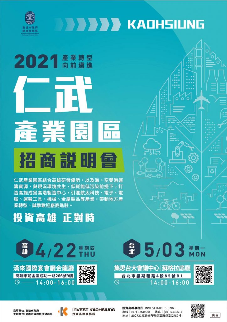 高雄仁武產業園區招商說明會4/22與5/3分別在高雄漢來大飯店、台北集思台錒會議中心舉辦,說明會將針對園區規劃內容、進駐條件及辦法等詳細報告,經發局表示,仁武產業園區動土後,超過265家企業詢問進駐,歡迎有興趣的企業報名參與說明會。
