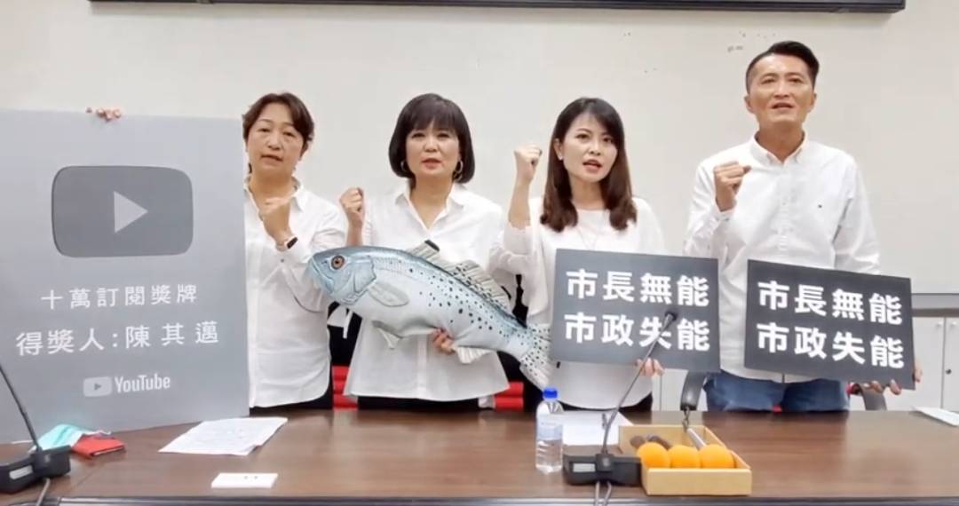 巿議員宋立彬以陳其邁任內「交安、治安、環安、工安、食安」都不安,希望陳其邁回歸市政,不要只想當網紅,並拿了點閱率破十萬的「銀牌獎」上前,要陳其邁既然拿牌了,就回來「好好當市長」。
