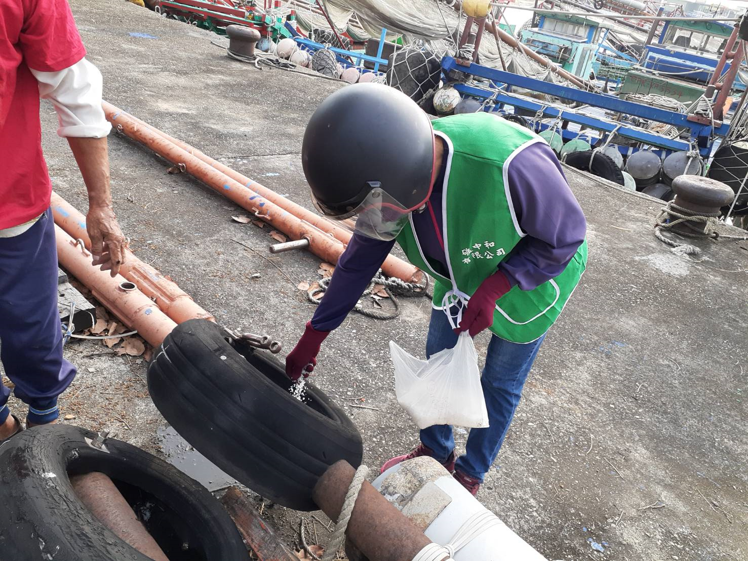 海洋局表示,各漁港辦公室在今年初已啟動登革熱防治自主檢查作業,針對漁港加強環境整頓工作,特別就港區的水、陸域、溝渠、人孔蓋等處加強清潔。此外,針對漁港周圍覆蓋網具之塑膠布、帆布及港區碼頭輪胎、碰墊等加強積水清除,另利用粗鹽能抑制病媒蚊孳生的特性,在隱蔽難清的角落如輪胎的內緣或溝渠灑上粗鹽。